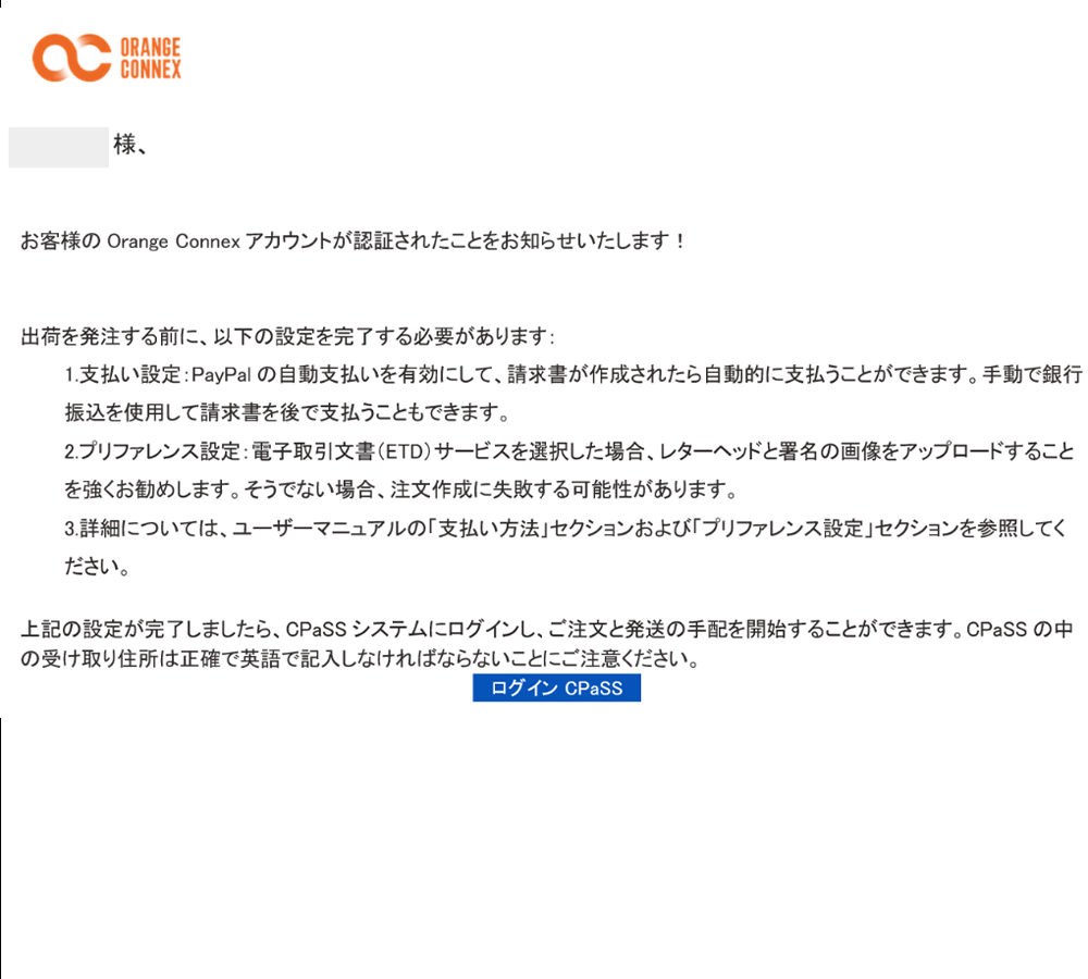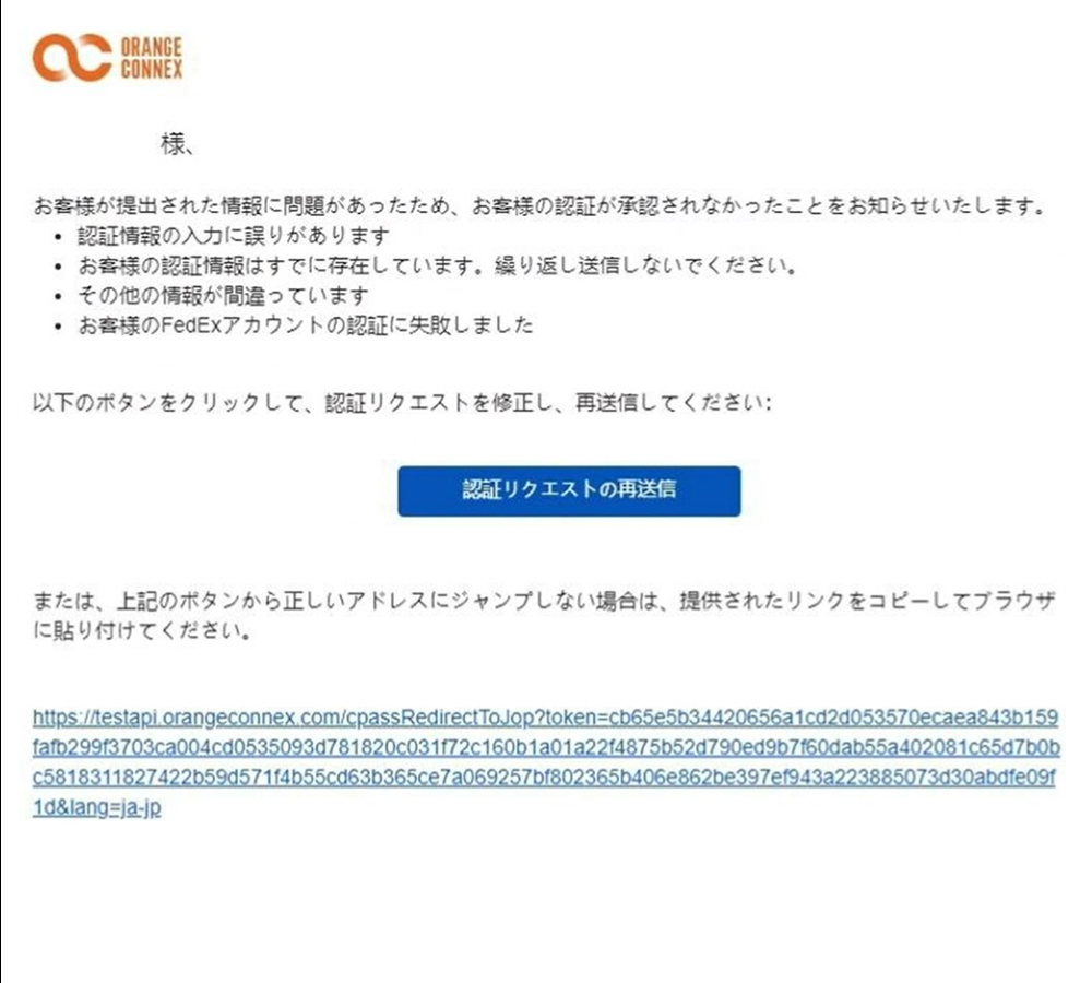 その理由を記載したメールが送信されます。通知メールに沿って認証情報を修正して再提出してください。不明な点等ある場合は、OCカスタマーサポート(CS.JP@OrangeConnex.com)までお問い合わせください。