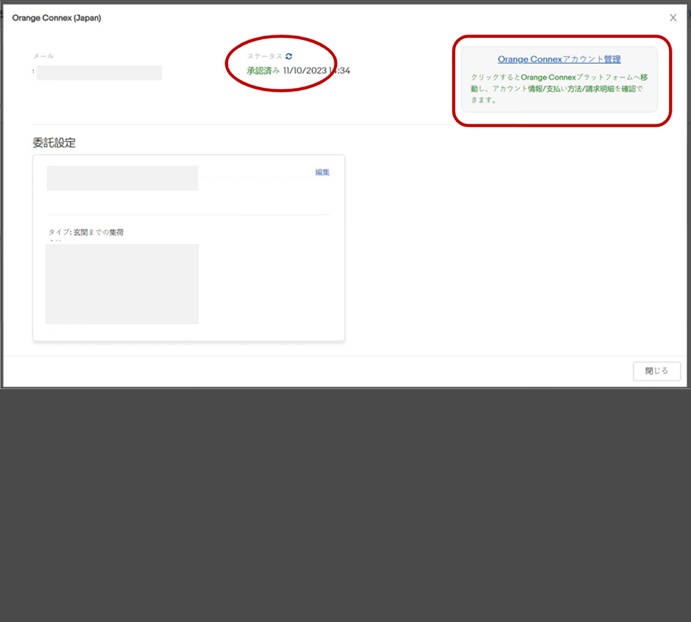 OCから認証成功のメールが届いた際には、指示に従いCPaSSアカウントにログインし、「Orange Connex (Japan)」の[設定]でステータスが「承認済み」に更新されていることを確認します。